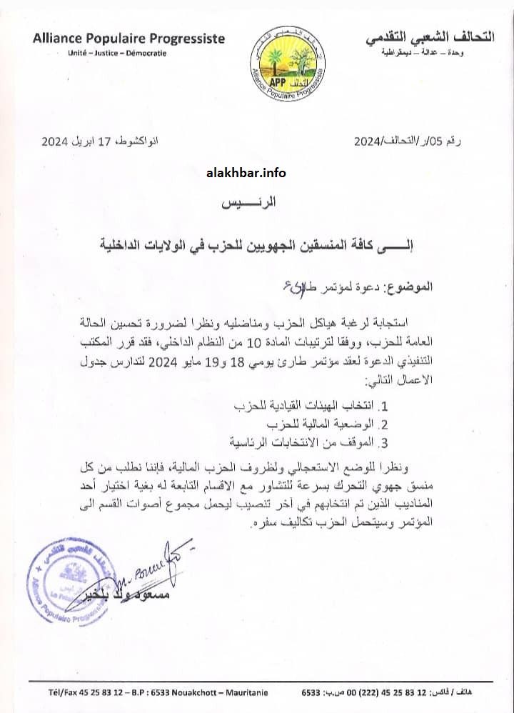 وجه المكتب التنفيذي لحزب التحالف الشعبي التقدمي دعوة إلى منسقي الحزب في الولايات لاختيار مناديب لحضور مؤتمر طارئ حدد له يومي 18 و19 مايو القادم.