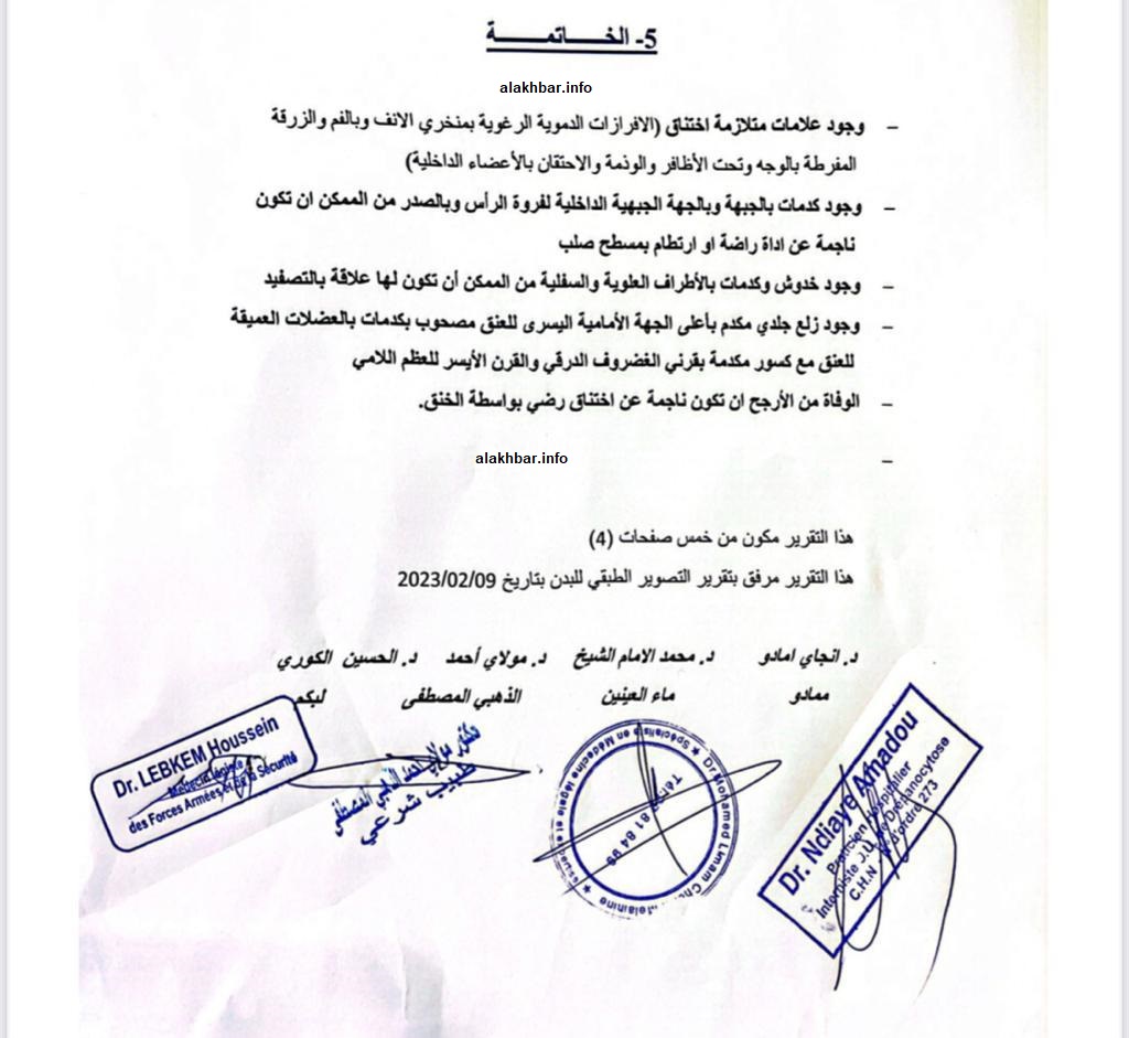قال الدكتور آمادو مامادو المشرف العام على تشريح جثمان الصوفي ولد الشين أن التشريح أثبت وجود رضية للعضلات العميقة في العنق