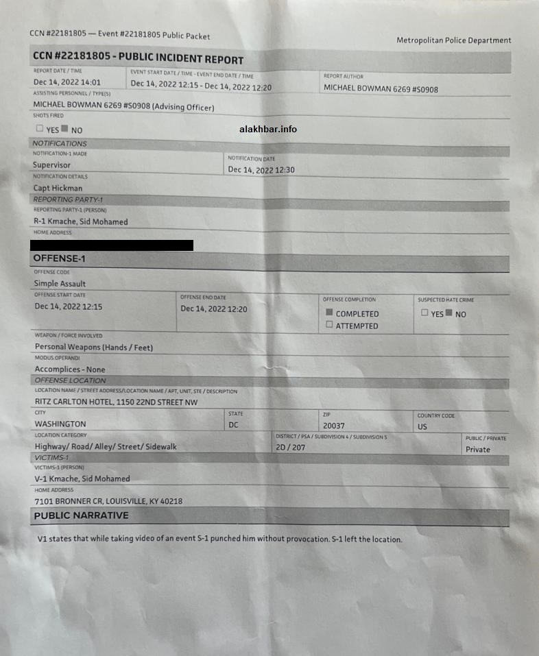 نشرنسخة من المحضر الذي أعدته الشرطة الأمريكية حول واقعة تعرض المدون الموريتاني سيدي محمد ولد كماش لـ"إعتداء" في الفندق الذي يقيم فيه الرئيس محمد ولد الغزواني، والوفد المرافق له الذي يشارك في القمة الإفريقية الأمريكية.