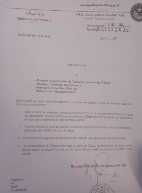 أصدر الأمين العام لوزارة المالية إدوم ولد عبدي ولد اجيد تعميما يشترط توقيعه على جميع العقود التي تربط الإدارات التابعة لقطاعه بجهات أخرى مهما كانت.