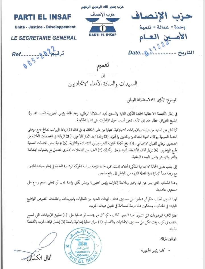 طالب حزب الإنصاف الحاكم في موريتانيا هيئاته على مختلف المتسويات بتنظيم فعاليات ومهرجات ونقاشات بخصوص المواضيع الواردة في خطاب الرئيس محمد ولد الغزواني بمناسبة الذكرى 62 للاستقلال الوطني.