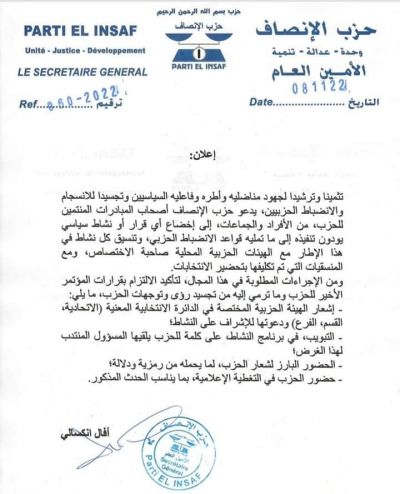 حزب الإنصاف يقرر إلزام منتسبيه بالتنسيق مع الهيئات الحزبية المحلية قبل تنظيم أي مبادرة أو تظاهرة سياسية