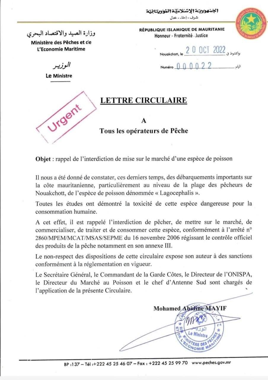وأوضح تعميم وقعه الوزير ووجهه إلى مختلف الفاعلين في قطاع الصيد، أن كميات معتبرة من سمك الفهقة وصلت مؤخرا شاطئ الصيادين في نواكشوط.