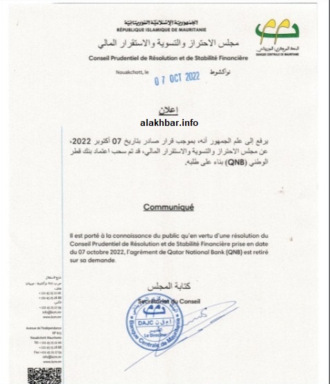 قرر البنك المركزي الموريتاني سحب اعتماد فرع بنك قطر الوطني QNB في موريتانيا، وذلك بناء على طلبه.