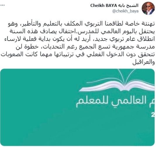 وقال ولد بايه في تغريدة على حسابه في تويتر إن الاحتفال باليوم العالمي للمدرس يصادف هذه السنة انطلاق عام تربوي جديد، أريد له أن يكون بداية فعلية لارساء مدرسة جمهورية تسع الجميع رغم التحديات.