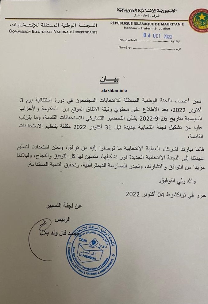 أعلن رئيس اللجنة الوطنية المستقلة للانتخابات محمد فال ولد بلال وأعضاؤها استقالتهم من اللجنة، واستعدادهم للتعاون مع اللجنة الجديدة التي اتفقت الحكومة والأحزاب السياسية على تشكيلها قبل نهاية أكتوبر الجاري.