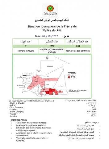 أعلنت وزارة التنمية الحيوانية ارتفاع الحالات المسجل من حمى الوادي المتصدع إلى 264 حالة في 7 بؤر وذلك بعد إجراء 1092 تحليلا طبيا.
