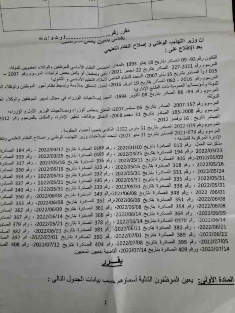تداولت مجموعات على الوات ساب لمدرسين مذكرة عمل صادرة عن وزارة التهذيب الوطني تفيد بتعيين 40 شخص في عدة وظائف داخل الادارات الجهوية و المركزية