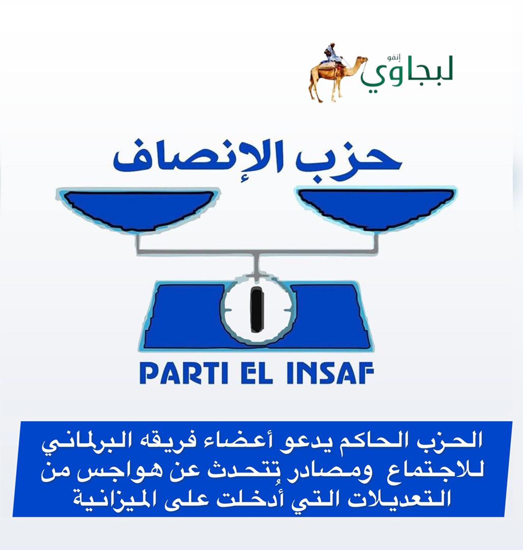 وجه رئيس حزب الإنصاف الحاكم محمد ماء العينين ولد أييه دعوة لأعضاء فريقه البرلماني لحضور اجتماع سيعقد غدا الأحد بفندق مونوتل عند الساعة الخامسة مساءا