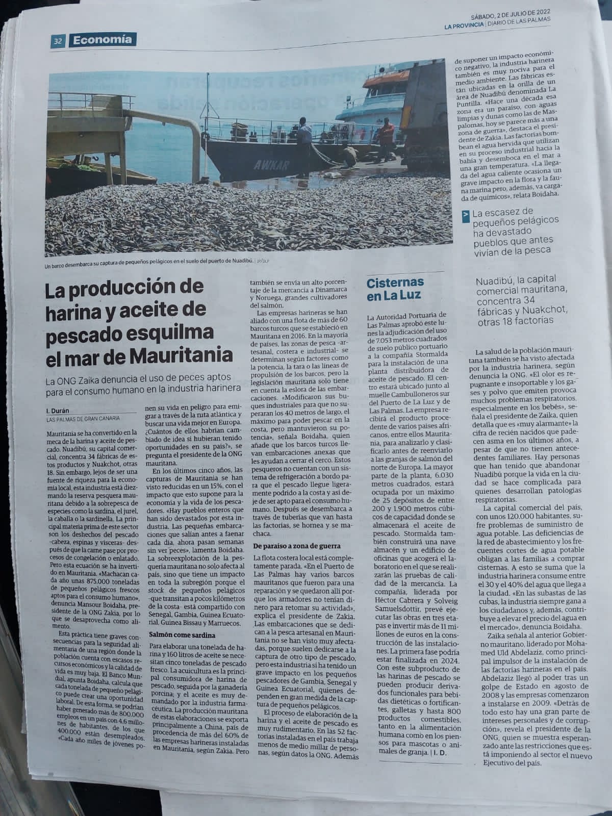 في عددها الجديد وبعد مقابلتها مع رئيس منظمة زاكيا في لاسبلماس عالجت جريدة لا بروفانسيا الإسبانية قضية الثروة البحرية في موريتانيا، وابانت عن الكثير من الاختلالات الخطيرة التي يجب أن تتنبه لها النخبة السياسية