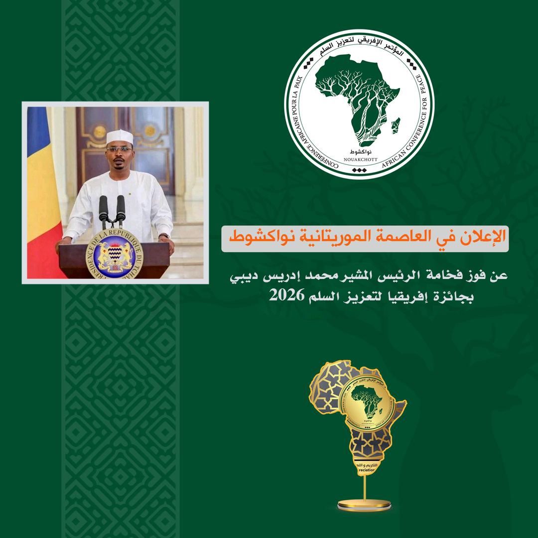 أعلن المؤتمر الإفريقي لتعزيز السلم عبر لجنة جائزة إفريقيا لتعزيز السلم عن قرارها الرسمي بمنح الجائزة لعام 2026 للرئيس التشادي محمد إدريس ديبي، وذلك عقب اجتماع لجنة الخبراء الدوليين الذي انعقد في مقر الأمم المتحدة بمدينة جنيف بسويسرا، باستضافة جامعة السلام العالمية.