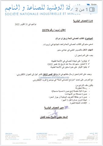 أعلنت الشركة الوطنية للصناعة والمناجم "سنيم" عن رغبتها في اكتتاب أخصائيين، في الأشعة وأمراض النساء والتوليد، والتخذير والانعاش والصيدلة لعيادتها بازويرات ونواذيبو.