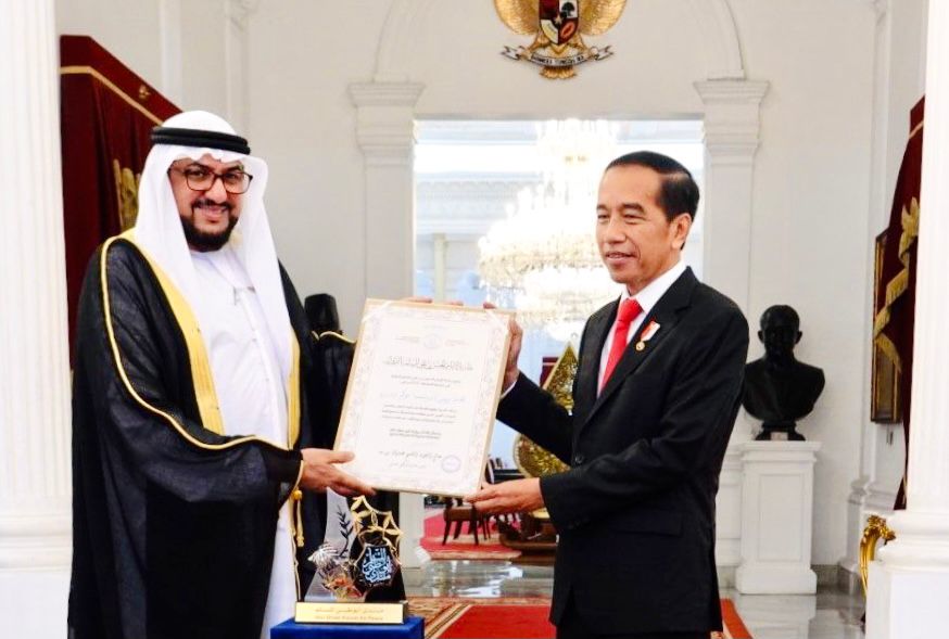سلم الشيخ المحفوظ بن بيه؛ أمين عام منتدى أبوظبي للسلم، الإثنين في جاكرتا، لرئيس جمهورية إندونيسيا جوكو ويدودو، جائزة المنتدى لسنة 2022 (جائزة الحسن بن علي للسلم الدولية)، بحضور عبدالله سالم الظاهري، سفير دولة الإمارات العربية المتحدة لدى إندونيسيا.