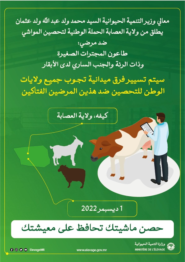 لقد تقرر وللأول مرة، مجانية التحصين ضد مرضي طاعون المجترات الصغيرة، وذات الرئة والجنب الساري لدى الأبقار على نفقة الدولة تنفيذا لتوجيهات فخامة رئيس الجمهورية السيد محمد ولد الشيخ الغزواني الرامية إلى تحصين الثروة الحيوانية وتثمينها، حيث سيتم تحصين 2.300.000 رأس من الأبقار و 7.000.000 رأس من المجترات الصغيرة مع وضع علامة في الأذن للماعز و الأغنام المحصنة لتفادي تكرار التحصين في الحملات المقبلة.