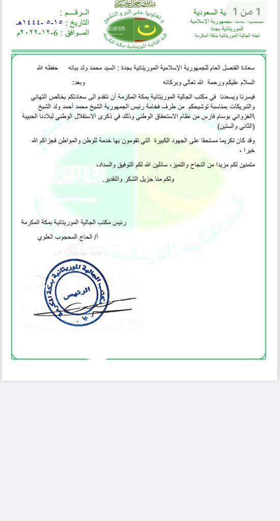 هنأ رئيس الجالية الموريتانية بمكة المكرمة الحاج المحجوب العلوي باسم أعضاء الجالية، سعادة القنصل العام للجمهورية الإسلامية الموريتانية بجدة السيد / محمد ولد ببانه وذلك بمناسبة توشيحه من قبل رئيس الجمهورية في الذكرى الثانية والستين لعيد الاستقلال الوطني.