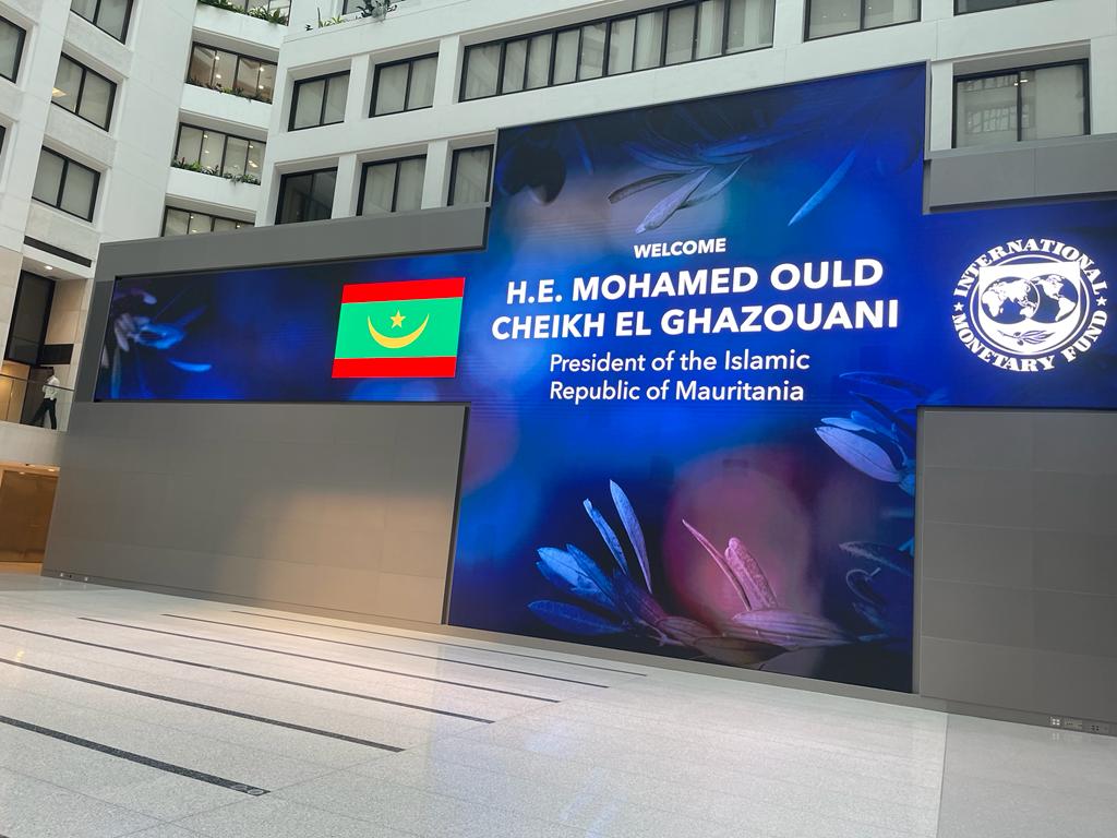 ووضع صندوق النقد الدولي لافتة ترحيب بولد الغزواني على واجهة المبنى الرئيسي له في واشنطن.