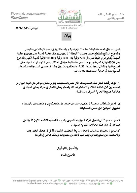دعا منتدى المستهلك الموريتاني السلطات المعنية إلى "الضرب بيد من حديد على المحتكرين والمضاربين بالأسعار وتطبيق القوانين التي تحمي المستهلك".