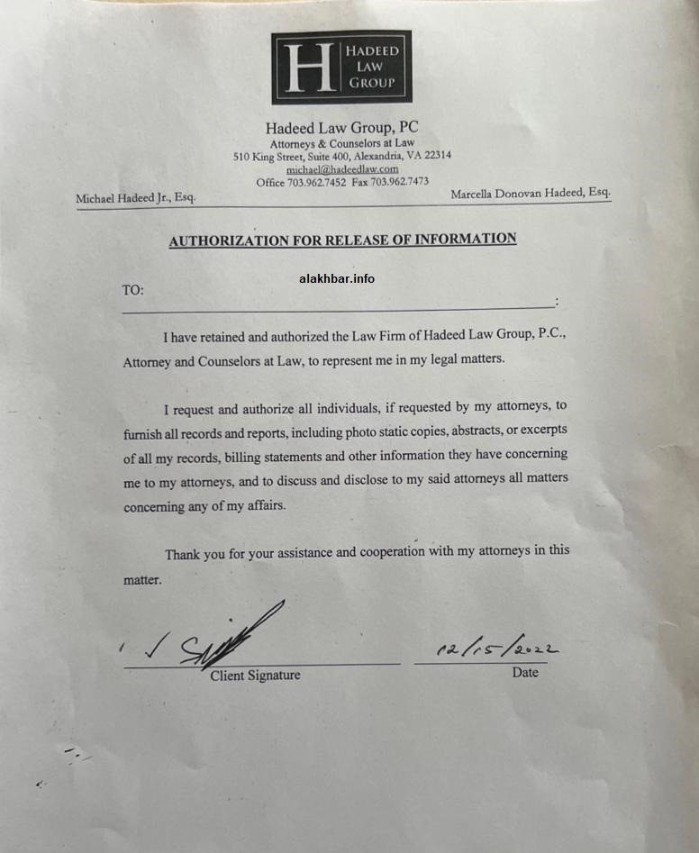وتقدم ولد اكماش – إثر الحادث - بشكاية عبر مكتب محاماة في منطقة العاصمة واشنطن بتاريخ 15 ديسمبر 2022 حيث تقدم المكتب بطلب - حصلت الأخبار على نسخة منه - للحصول على تسجيلات الفندق المتعلقة بالحادث.