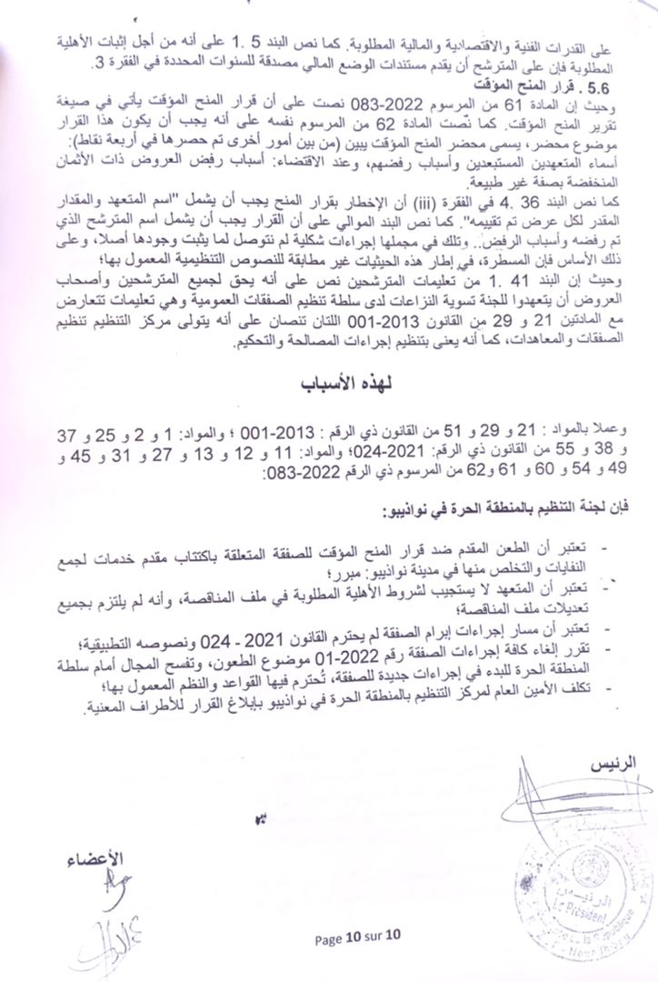 وبحسب القرار فإن لجنة التنظيم بالمنطقة الحرة اعتبرت أن الطعن المقدم ضد قرار المنح المؤقت للصفقة المتعلقة باكتتاب مقدم خدمات لجمع النفايات والتخلص منها في مدينة نواذيبو مبرر.