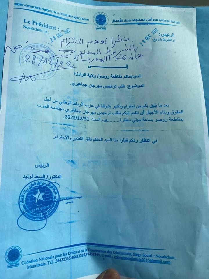 أقدمت السلطات الإداراية على مستوى ولاية اترارزة اليوم في مخالفة صريحة للقانون الموريتاني المنظم للأحزاب و لحرية التجمع و التظاهر و التعبير في مواده 14من الأمر القانوني رقم 024~91و المعدل بالقانون رقم 014 ~94 بالتراجع عن ترخيص مسبق بإقامة مهرجان جماهيري لحزب الرباط الوطني في مدينة روصوا يحضره الرئيس السابق محمد و لد عبد العزيز غدا السبت الموافق 31/12/2022.