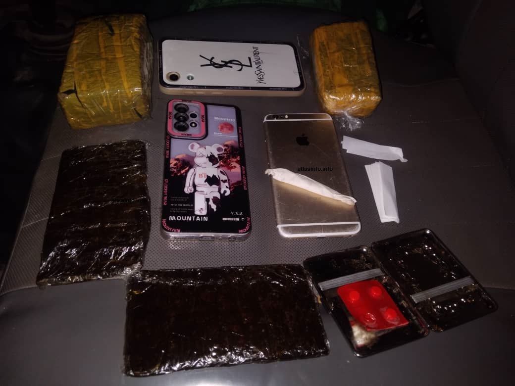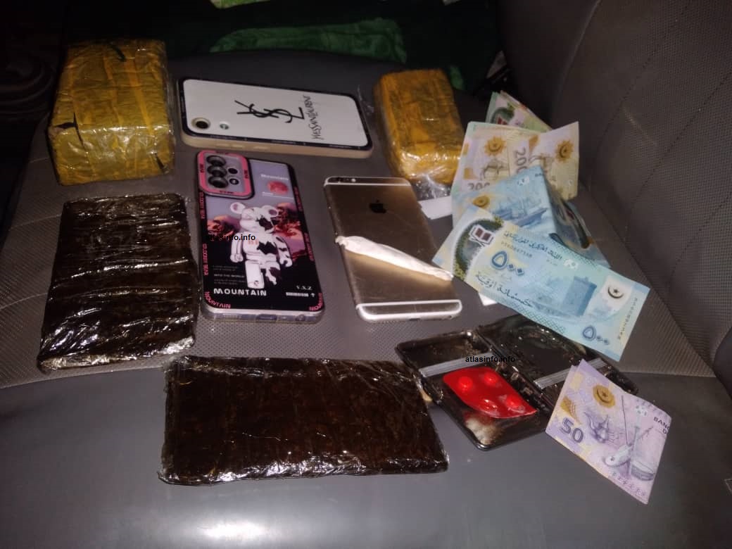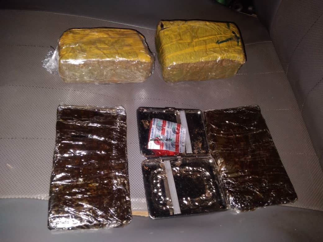 وأضافت المصادر أن السيارة لاذت بالفرار والقي القبض على شخصين هما: الشيخ 1995 و هارون 1994 ،بحوزتهما 500 غرام من "الحشيش الهندي" و قطعتين من الحجر المغربي (350 غرام).