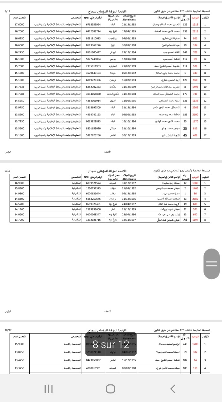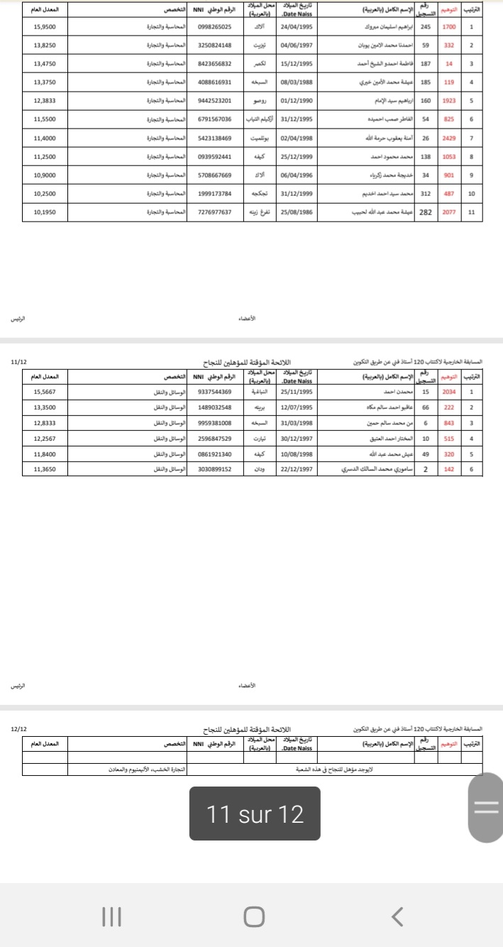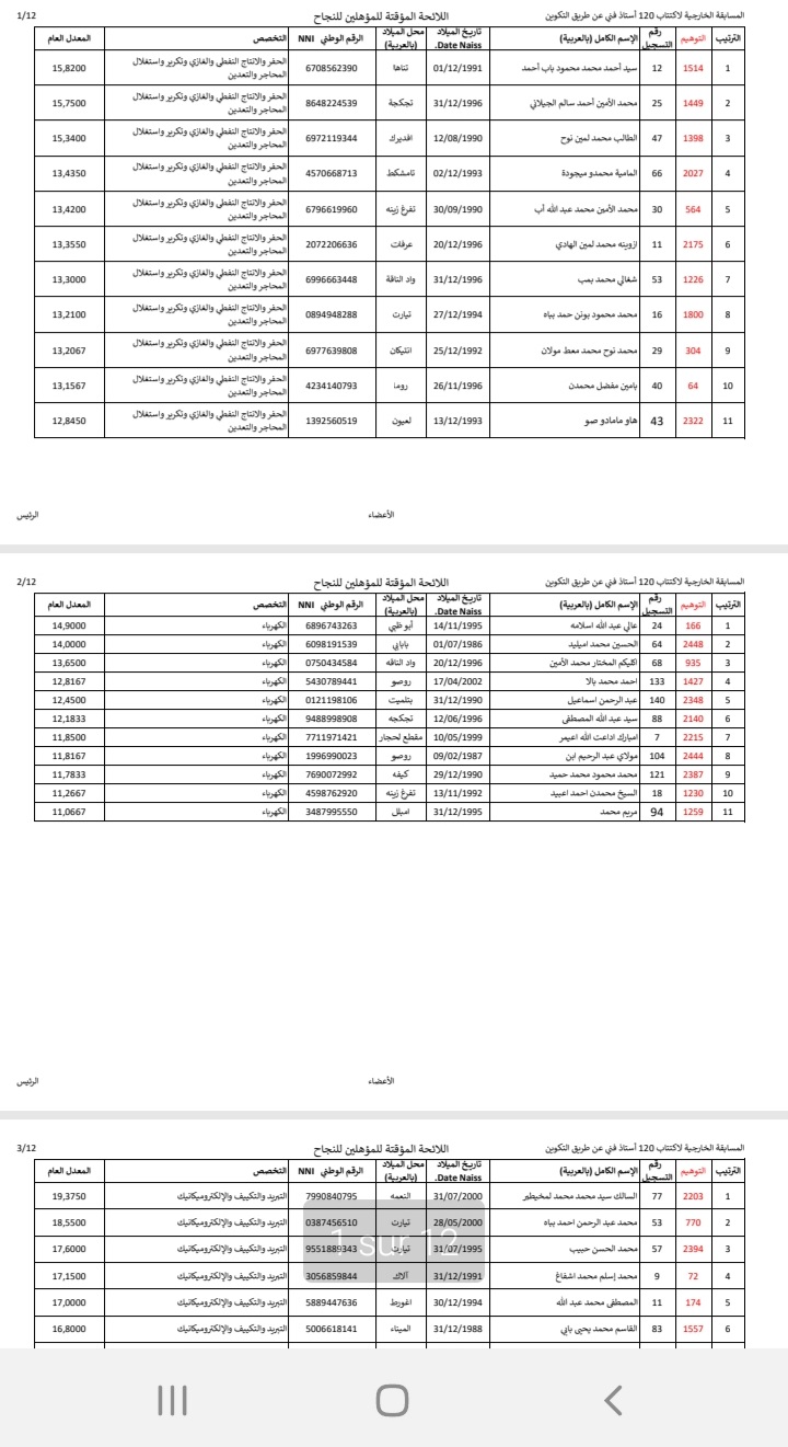 أعلنت اللجنة الوطنية للمسابقات أمس لائحة المؤهلين للنجاح في ﻣﺳﺎﺑﻘﺔ ﺍﻛﺗﺗﺎﺏ 120 ﺃﺳﺗﺎﺫﺍ ﻟﻠﺗﻌﻠﻳﻡ ﺍﻟﻔﻧﻲ ﻋﻥ ﻁﺭﻳﻖ ﺍﻟﺗﻛﻭﻳﻥ، وذلك حﺳﺏ ﺍﻟﺗﺭﺗﻳﺏ الاﺳﺗﺣﻘﺎﻗﻲ .