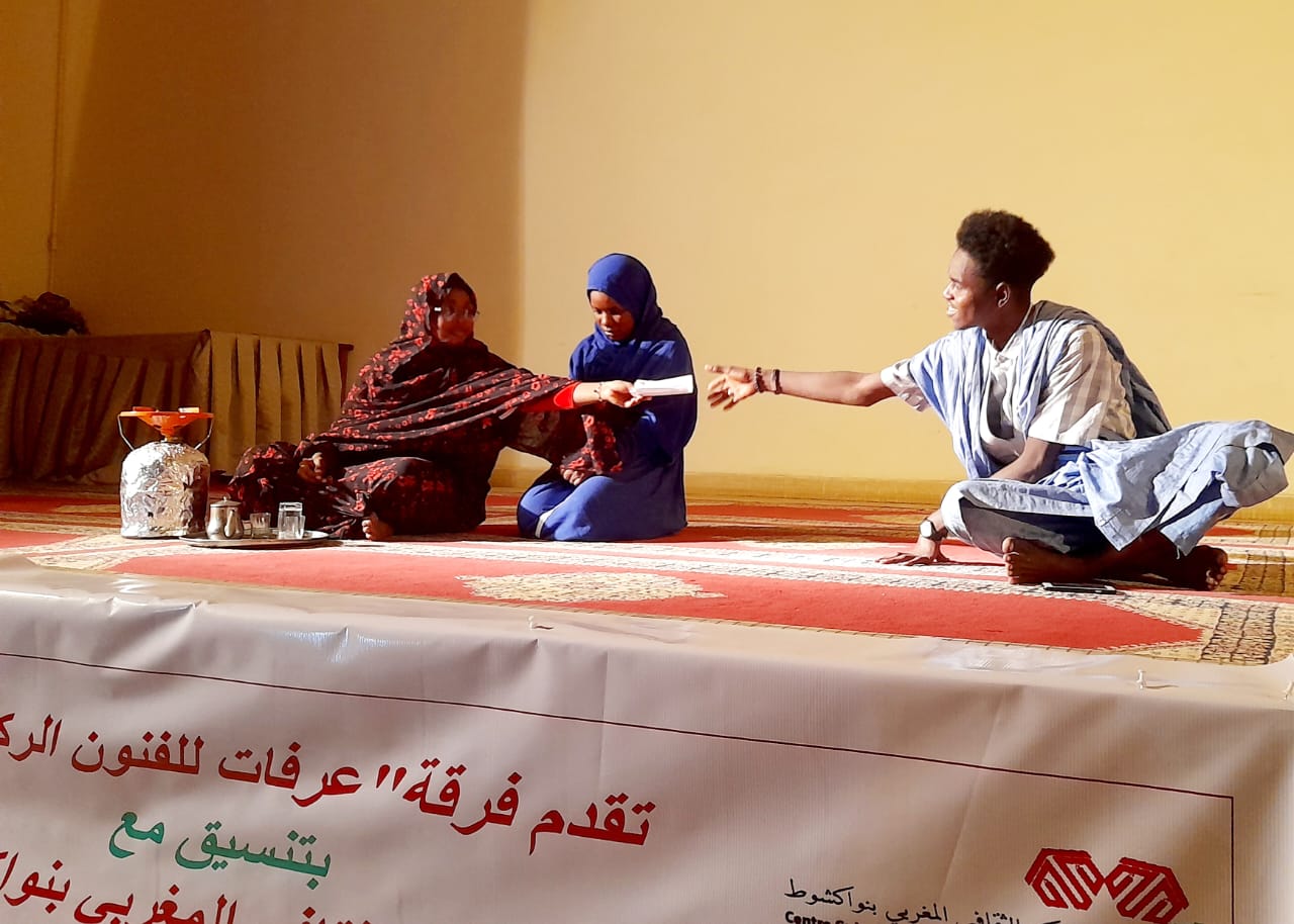 مدير المركز Alt مصطفى رحب في مستهل كلمة له بالحضور وقدم ورقة تعريفية تأطيرية عرف فيها المسرح وتاريخه في موريتانيا واهميته كما عرج على التعريف بفرقة عرفات الركحية وباعضائها وتاريخ تأسيسها.. واعلن السيد المدير المصطفى عن افتتاح ابواب المركز الثفافي المغربي امام كل عمل شبابي ثقافي جاد معلنا استعدادهم في المركز دعم واحتضان و مساندة وتطوير كل المواهب الموريتانية الشبابية خدمة للعلاقات الثقافية العليا بين البلدين العزيزين.. ويلاحظ اهتمام المركز الثقافي المغربي في السنوات الاخيرة بدعم الانشطة الشبابية في المسرح والموسيقى والرقص وهي مجالات تستهوي اعدادا كبيرة وقياسية من الشباب وهي تعالج امراض المجتمع كالمخدرات والانحراف وتفشي الامراض العويصة فضلا عن الوحدة الوطنية والتكافل الاجتماعي