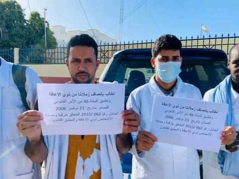 -تنفيذ المرسوم رقم 062/2015 المتضمن تطبيق المادة 46 المتعلق بترقية وحماية الأشخاص المعاقين، لرفع الظلم عن الممرض محمد محمود/محمد محمدو والممرضة أسلاكة / محمدفال المقاري