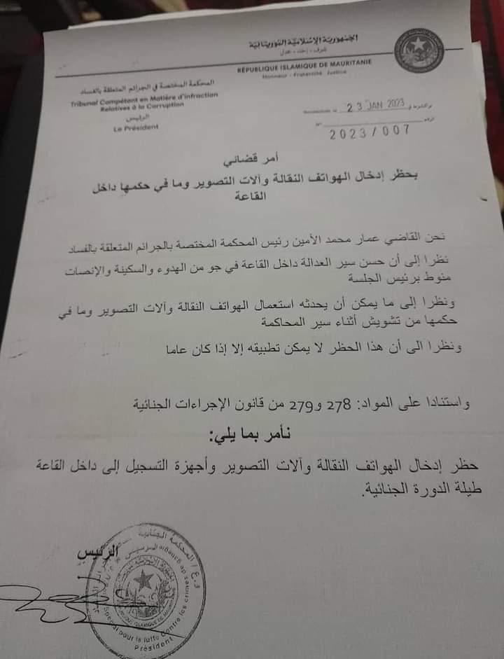 صدر رئيس المحكمة المكلفة بالفساد، القاضي عمار محمد الأمين، أمرا بحظر إدخال الهواتف النقالة وآلات التصوير وأجهزة التسجيل إلى القاعة طيلة الدورة الجنائية الحالية.