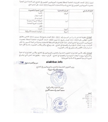 وقع وزيرا الداخلية واللا مركزية محمد أحمد ولد ولد محمد الأمين، والخارجية محمد سالم ولد مرزوك مقررا مشتركا حددا بموجبه ثماني دول في أربع قارات، يحق للجاليات الموريتانية فيها التصويت في الانتخابات القادمة.