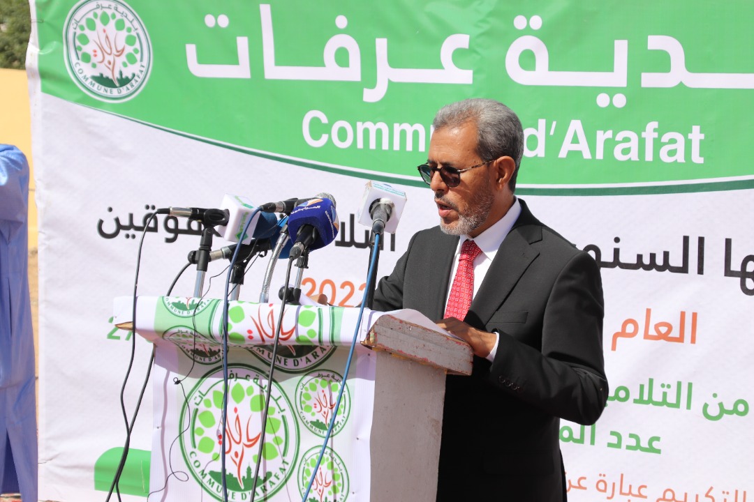 مفتش التعليم الأساسي بمقاطعة عرفات السيد ديديا ولد محمد ديدا ألقى كلمة بالمناسبة شكر خلالها البلدية على جهودها المستمرة لدعم التعليم في عرفات، مؤكدا أن هذا الجهد يتطابق مع إرادة رئيس الجمهورية الذي يضع في أولوياته إصلاح التعليم وتطوير جودته.