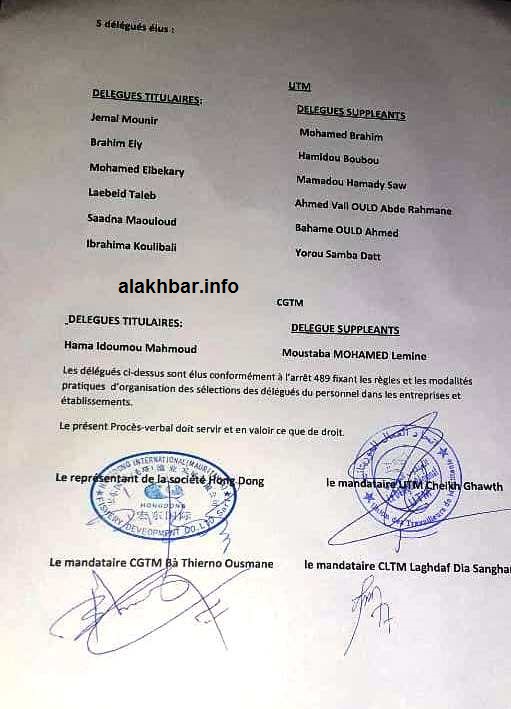 وحسب محضر الانتخابات فقد حصل اتحاد العمال الموريتانيين على 265 صوتا من أصل 320 صوتا وانتزع 6 مناديب من أصل 7 مناديب في الشركة فيما حصلت الكونفدرالية العامة لعمال موريتانيا على 48 صوتا ومندوب واحد فيما حصلت الكونفدرالية الحرة لعمال موريتانيا على 11 صوتا ولم تحصل على أي مندوب.