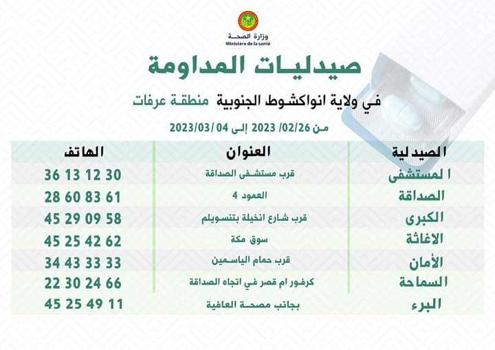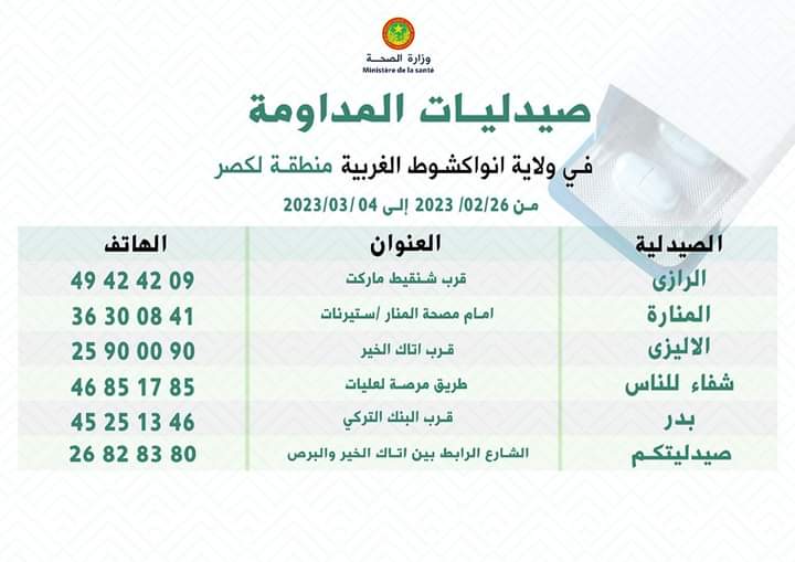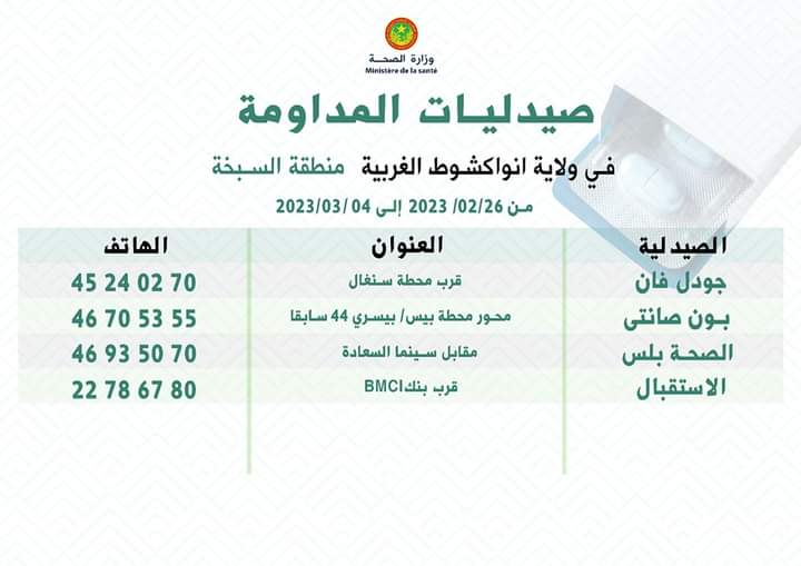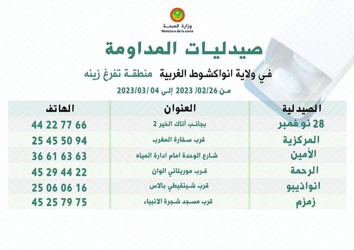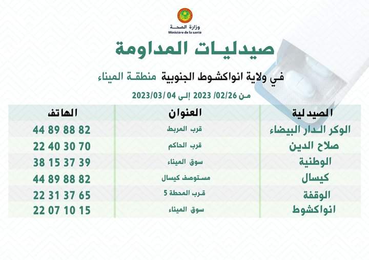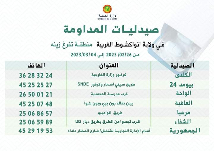 صيدليات المداومة بولايات أنواكشوط من 26 فبراير إلى 04 مارس 2023