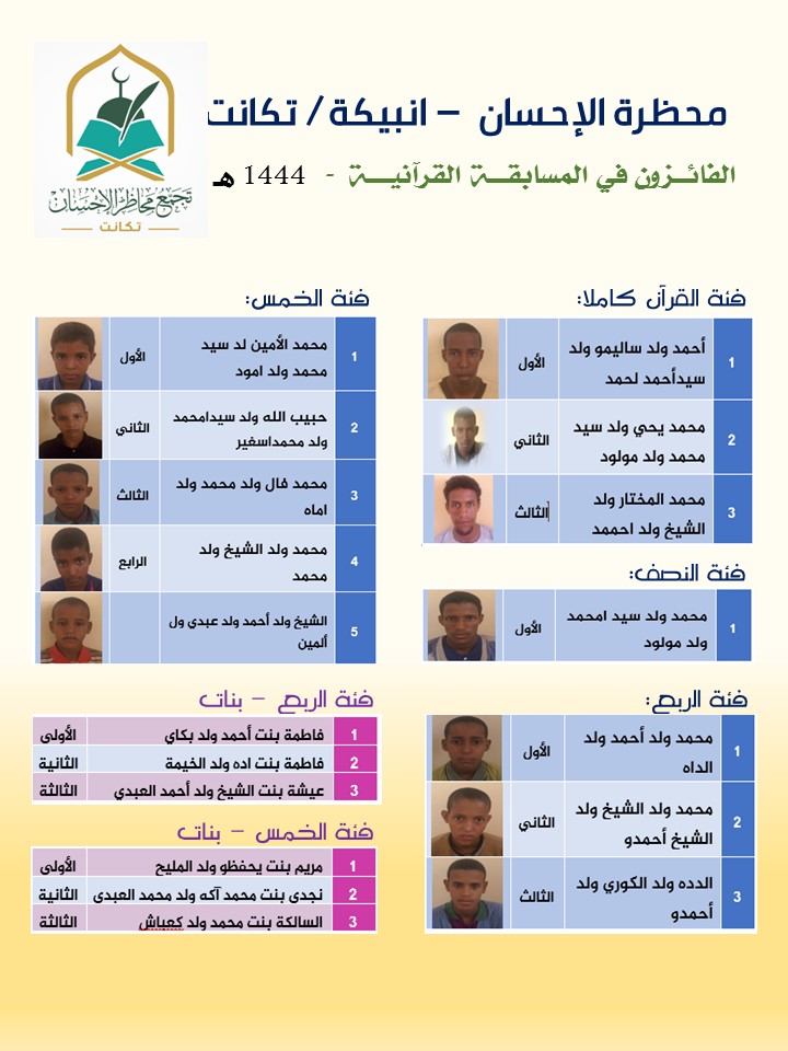 كما وزعت خلال الحفل جوائز المسابقة السنوية في حفظ القرآن الكريم على مستوى بلدية تامورت النعاج، والتي دأبت المحظرة على تنظيمها كل عام في شهر رمضان المبارك.