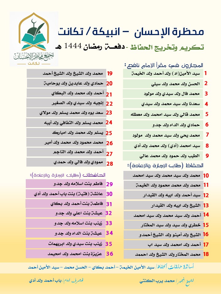 واحتضنت مدينة انبيكة بولاية تكانت حفلا لتكريم هذه الدفعة والبالغ عددها 36 من بينهم ثمان حافظات.