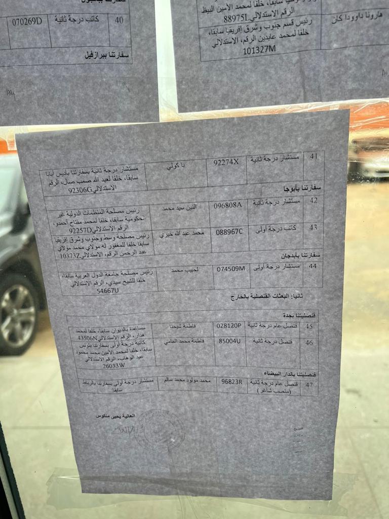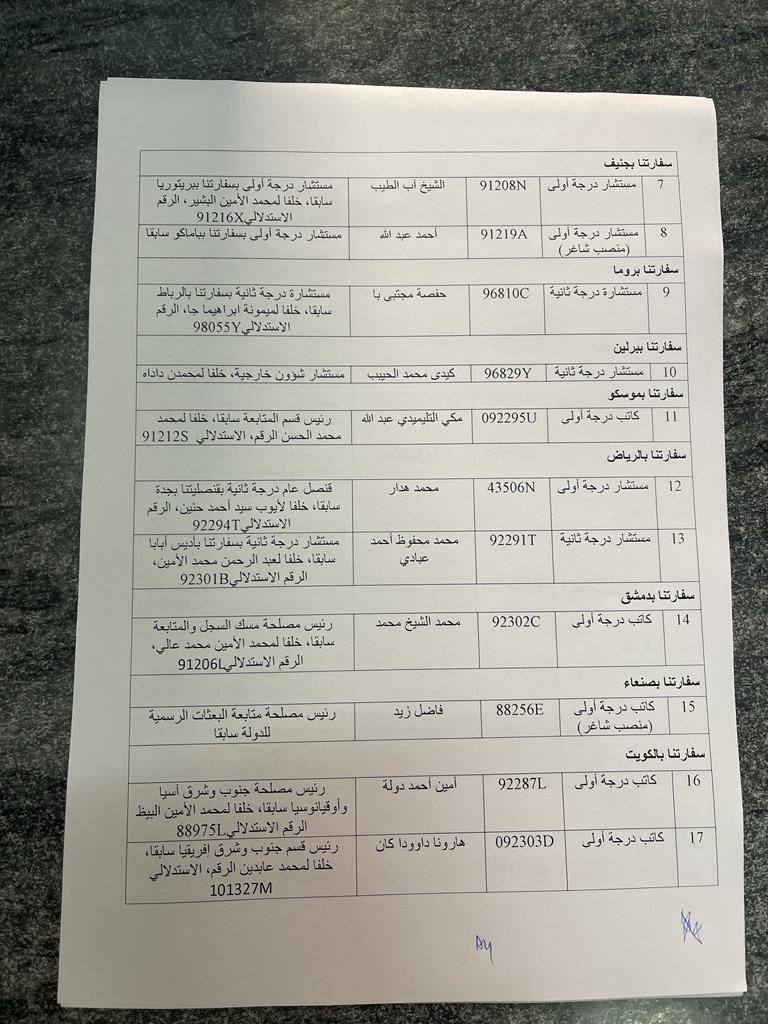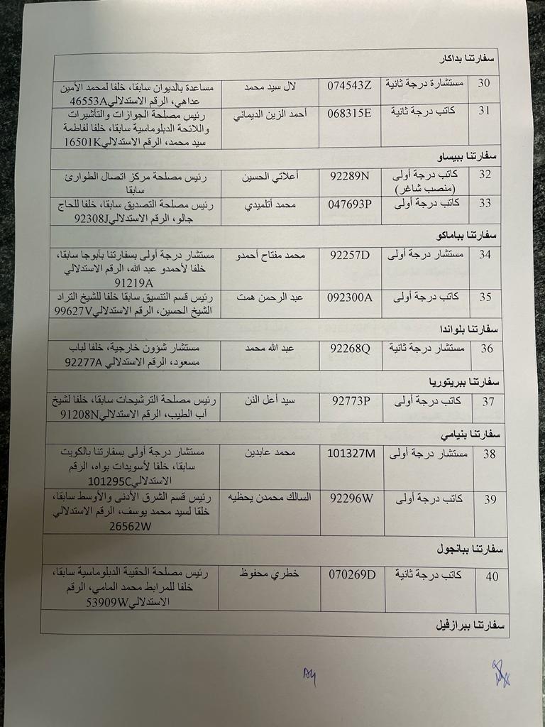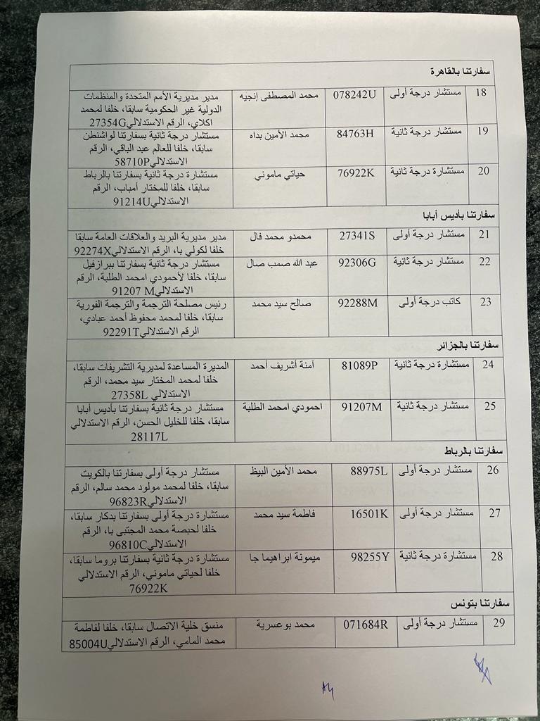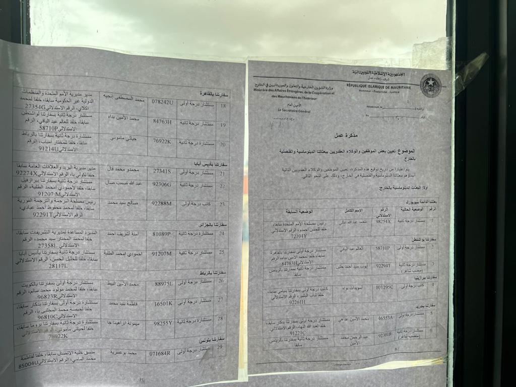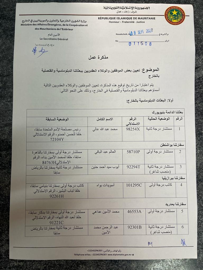 وقعت الأمينة العامة لوزارة الخارجية العالية بنت منكوس مذكرة عمل عينت بموجبها عشرات المستشارين الدبلوماسيين في العديد من البعثات الدبلوماسية الموريتانية حول العالم.