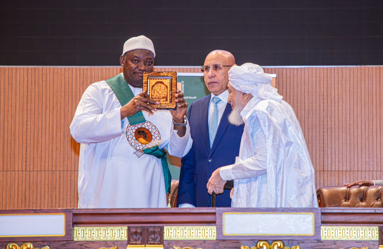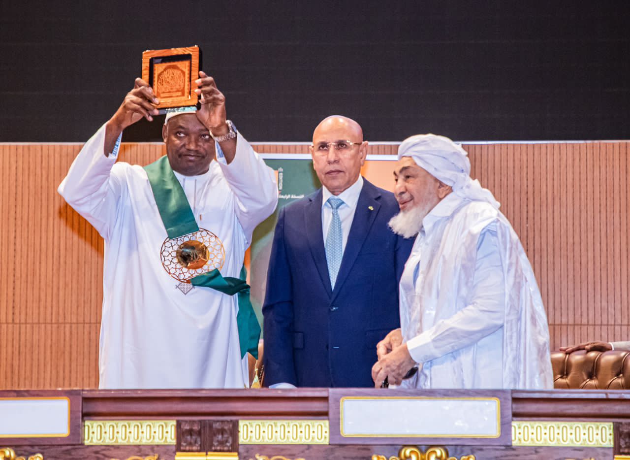 قدّم فخامة رئيس الجمهورية، السيد محمد ولد الشيخ الغزواني، اليوم الثلاثاء بالمركز الدولي للمؤتمرات "المرابطون" في انواكشوط، للرئيس الغامبي، السيد آدم بارو، جائزة "إفريقيا لتعزيز السلم"، خلال حفل إطلاق فعاليات النسخة الرابعة من المؤتمر الإفريقي لتعزيز السلم.