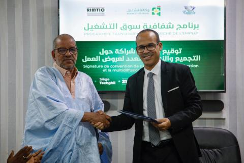 وقعت الوكالة الوطنية للتشغيل «تشغيل» اليوم الأربعاء، 21 فبراير 2024، اتفاقيتي شراكة في مجال جمع ونشر عروض العمل في السوق الموريتاني، مع بوابة (Beta Conseils)؛ أول بوابة رقمية للتوظيف والأخبار الاقتصادية في موريتانيا، ومنصة التوظيف والمناقصات في موريتانيا (RIMTIC)، وذلك في إطار الأنشطة الهادفة إلى تكريس شفافية سوق العمل.