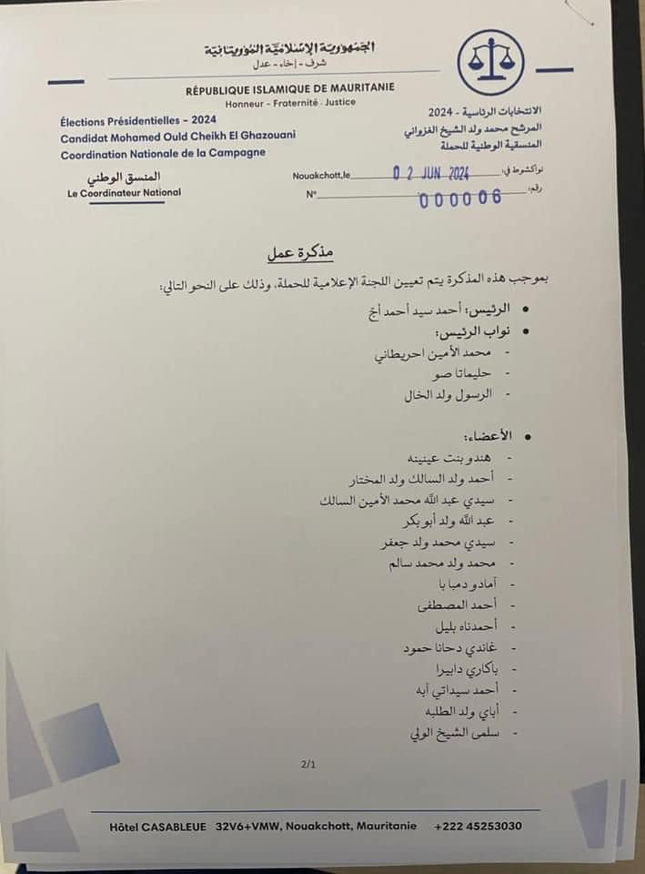أعلنت حملة الرئيس ولد محمد ولد الشيخ الغزواني اليوم الاثنين قائمة لجنتها الإعلامية لرئاسيات 2024.