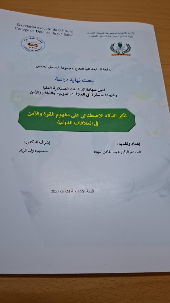 ومنحت اللجنة المشرفة على نقاش رسالة تخرج الضابط السامي ولد النهاه ميزة تقدير ممتاز على بحثه المعنون ب"تأثير الذكاء الاصطناعي على مفهوم القوة والأمن في العلاقات الدولية مع دراسة حالة موريتانيا في مجال الرقمنة.