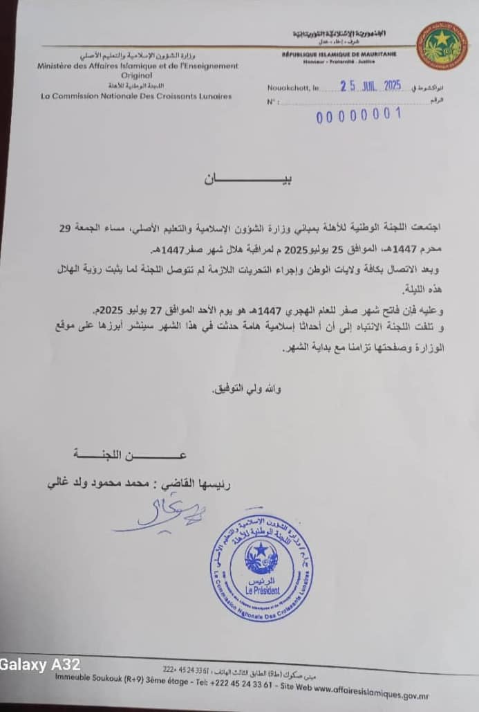 أعلنت اللجنة الوطنية لمراقبة الأهلة أن فاتح شهر صفر للعام الهجري 1447، هو يوم الأحد الموافق ل 27 يوليو 2025.