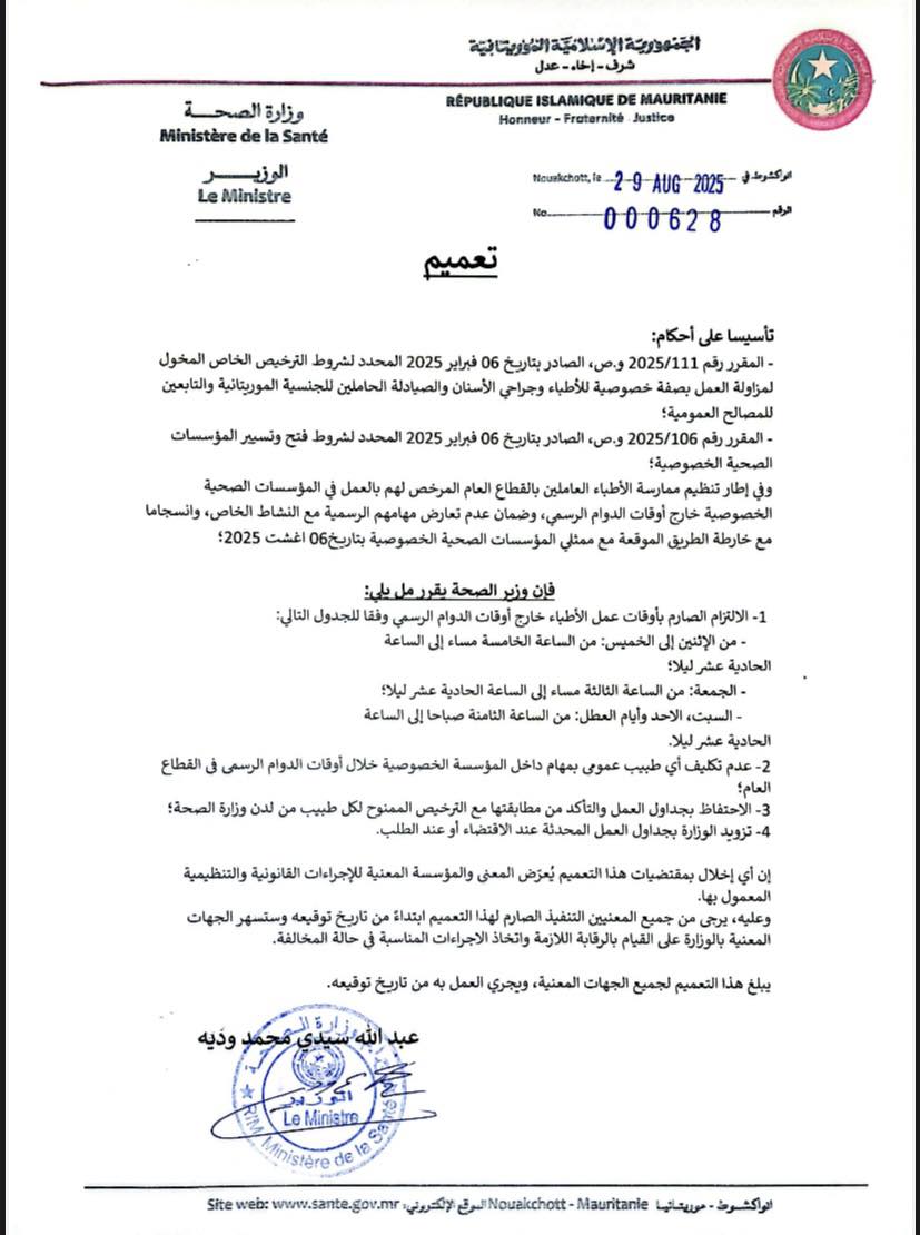 ألزم تعميم رسمي صادر عن وزير الصحة عبد الله سيدي محمد وديه، الأطباء بالالتزام الصارم بأوقات عملهم خارج أوقات الدوام الرسمي وفقا لنص التعميم التالي: