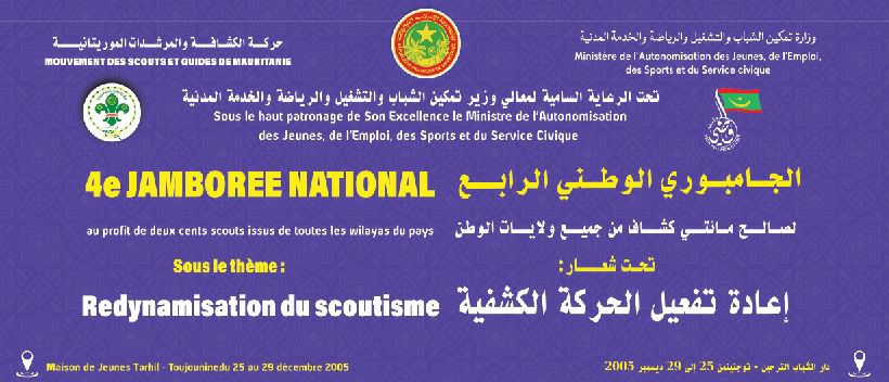أعلنت وزارة تمكين الشباب والتشغيل والرياضة والخدمة المدنية انطلاق المخيم (الجامبوري) الوطني الرابع المنظم غدا بدار الشباب الترحيل بتوجنين من طرف القطاع بالشراكة مع حركة الكشافة والمرشدات الموريتانية تحت شعار: إعادة تفعيل الحركة الكشفية.