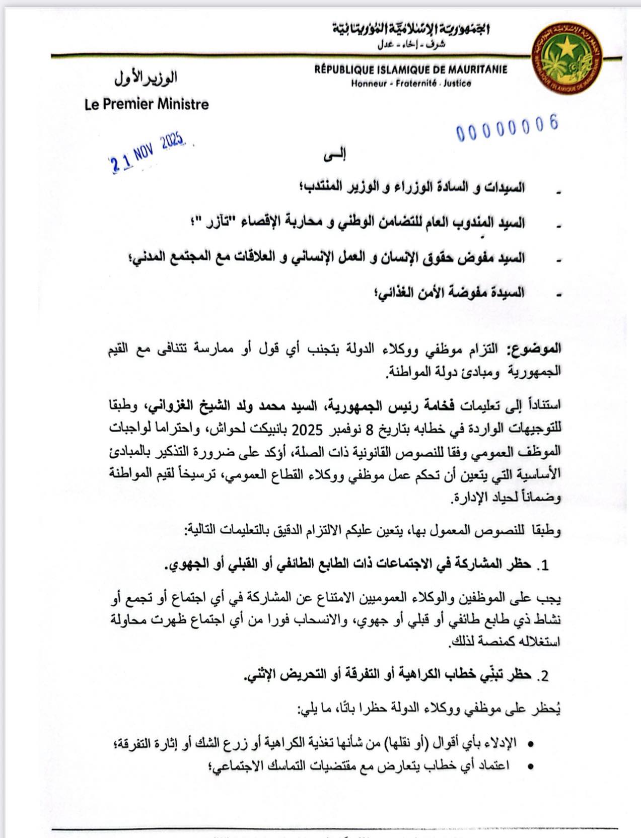 أصدر الوزير الأول المختار ولد اجاي تعميما إداريا وموجّها لأعضاء الحكومة ومؤسسات الدولة، بمنع مشاركة الموظفين والوكلاء العموميين في أي تجمعات ذات خلفية قبلية أو فئوية، مع الانسحاب فورًا من أي لقاء تظهر فيه نزعة التوظيف القبلي أو التحريض على الانتماء العرقي أو الجهوي.