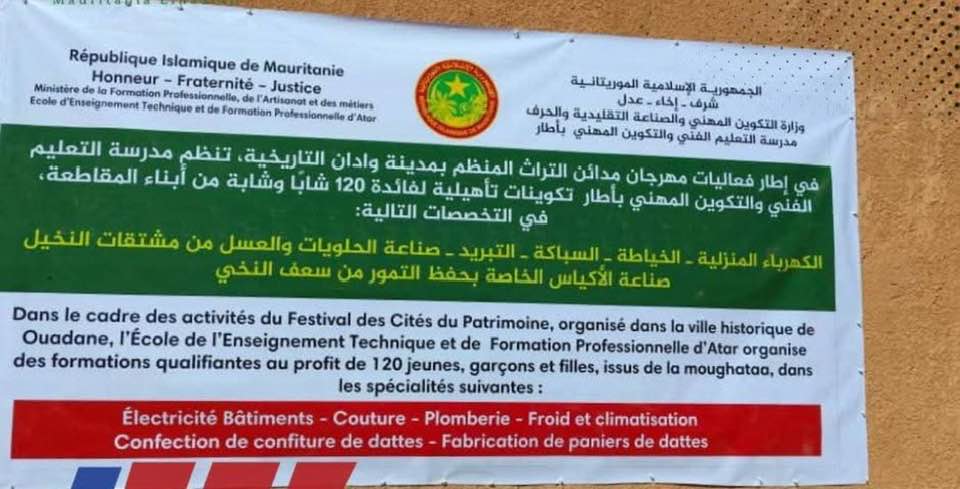 أطلقت مدرسة التعليم الفني والتكوين المهني بأطار دورة تكوينية تستهدف تكوين وتأهيل 120 شابًا من مقاطعة وادان، في إطار مشاركة وزارة التكوين المهني والصناعة التقليدية والحرف في المكوّنة التنموية من مهرجان مدائن التراث وادان 2025،
