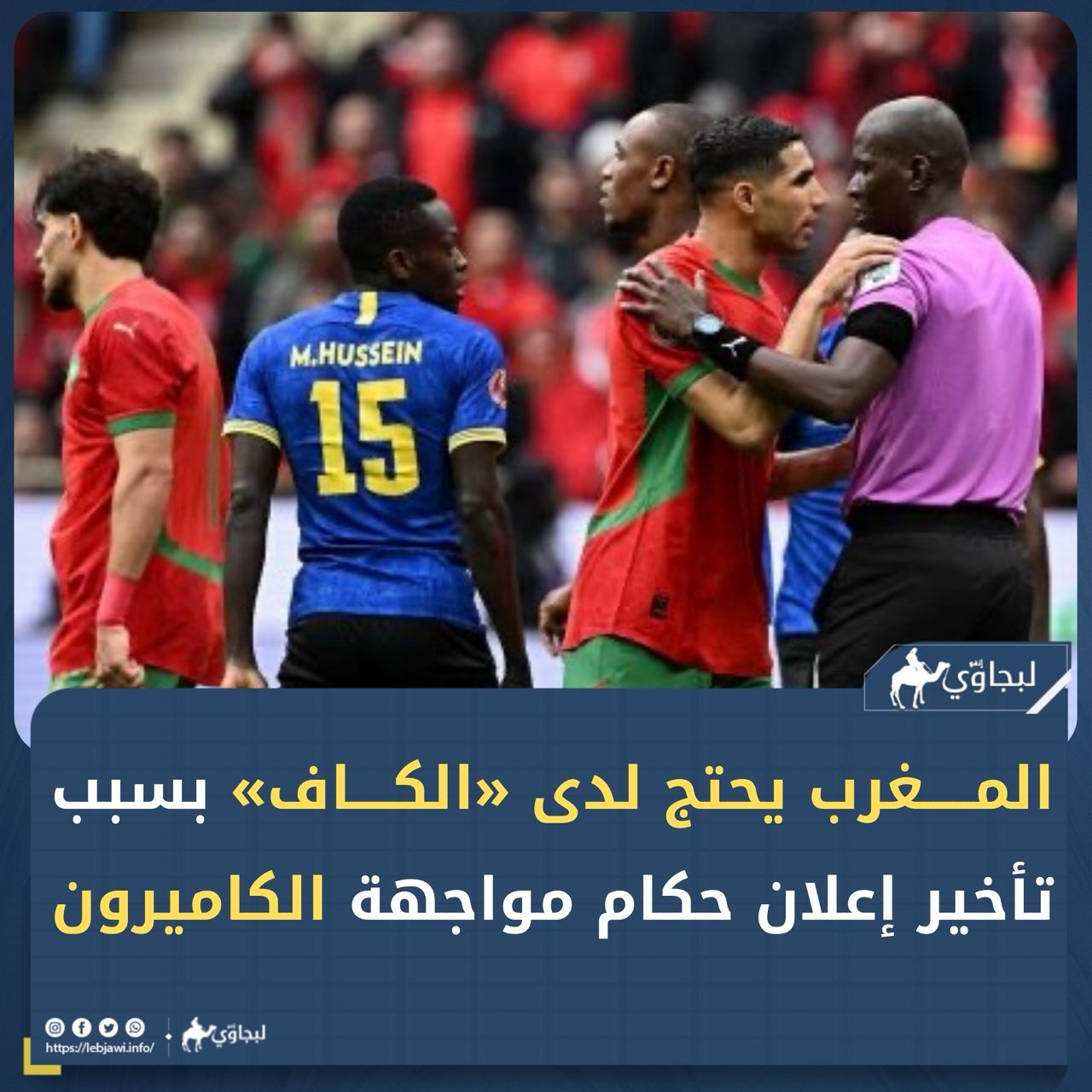 قدّم المغرب اعتراضاً رسميا إلى الاتحاد الإفريقي لكرة القدم، على تأخر الإعلان عن الطاقم التحكيمي لمباراة المنتخب المغربي المرتقبة أمام الكاميرون، ما أثار حالة من الاستياء داخل المعسكر الوطني.