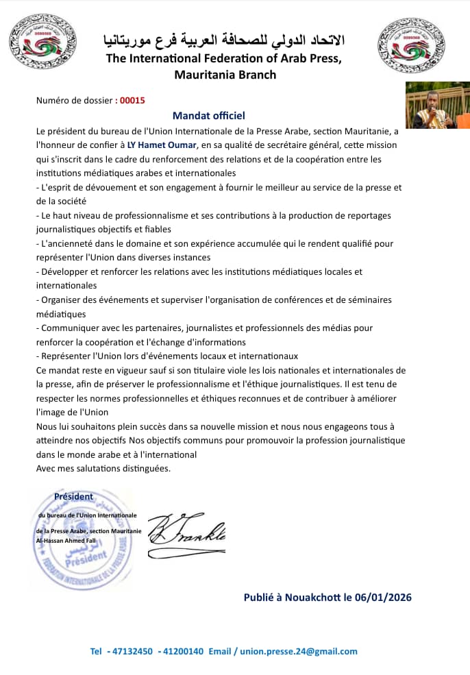 Le président du bureau de l'Union Internationale de la Presse Arabe, section Mauritanie, a l'honneur de confier à LY Hamet Oumar, en sa qualité de secrétaire général, cette mission qui s'inscrit dans le cadre du renforcement des relations et de la coopération entre les institutions médiatiques arabes et internationales