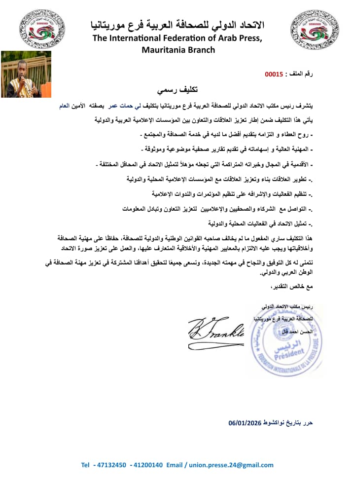 يتشرف رئيس مكتب الاتحاد الدولي للصحافة العربية فرع موريتانيا بتكليف لي حمات عمر بصفته الأمين العام