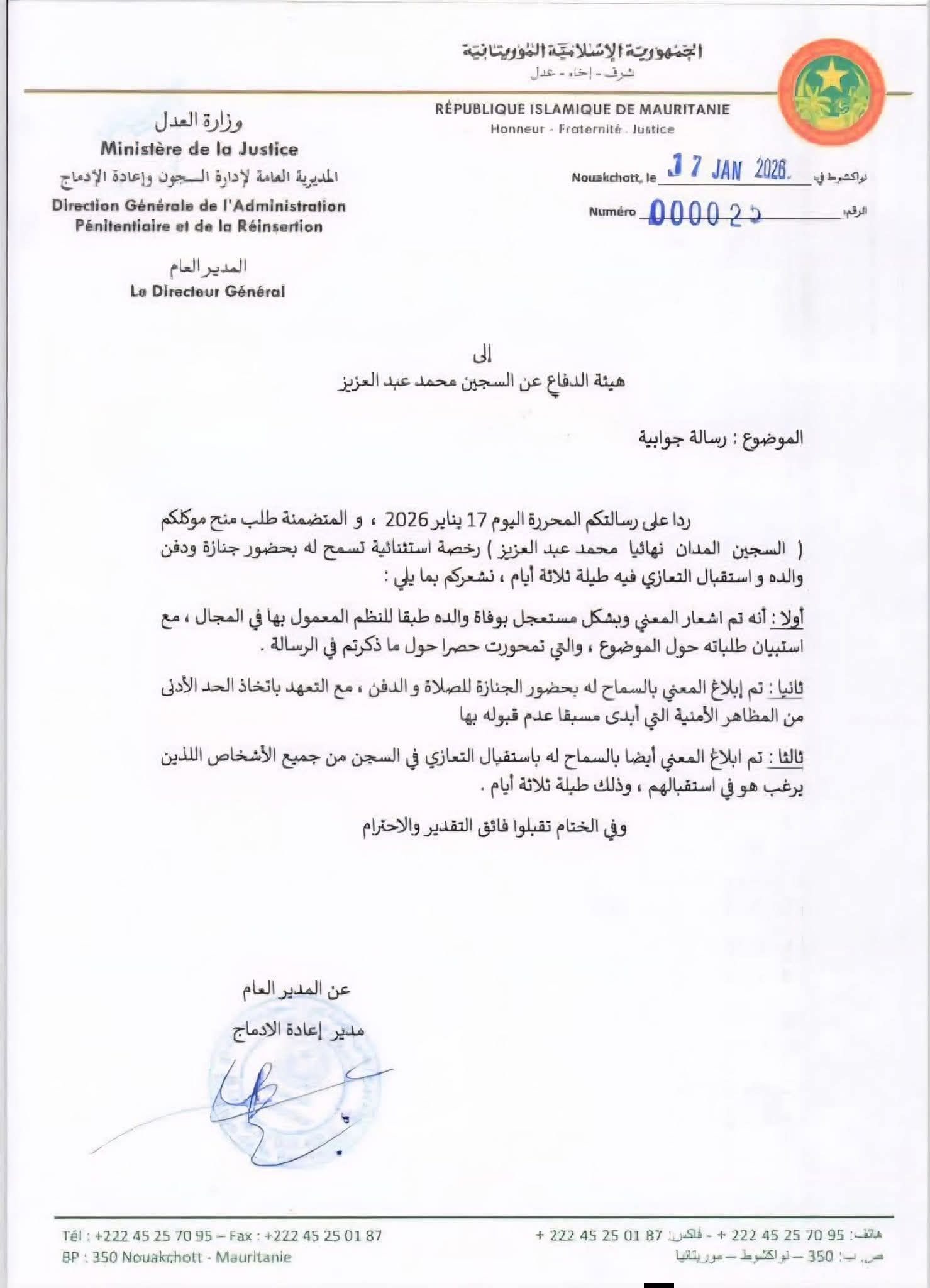 قررت السلطات المعنية السماح للرئيس السابق محمد ولد عبد العزيز بحضور الصلاة على والده ودفنه.