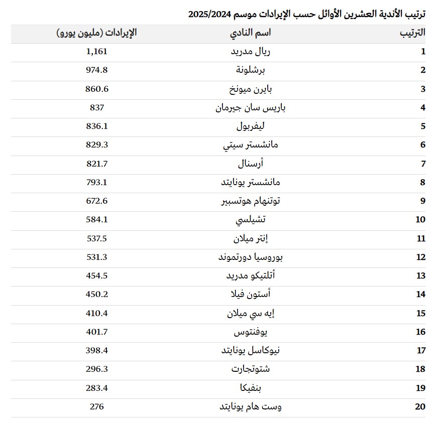 في حين سجل ليفربول سابقة تاريخية كأعلى نادٍ إنجليزي دخلاً بحلوله خامساً (836 مليون يورو)، متفوقاً على مانشستر سيتي الذي تراجع للمركز السادس.